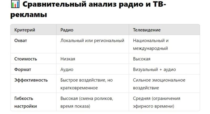 Радио особенно эффективно для рекламы на локальном уровне. Региональные станции охватывают конкретные группы людей, что позволяет точечно воздействовать на аудиторию. - Низкая стоимость производства